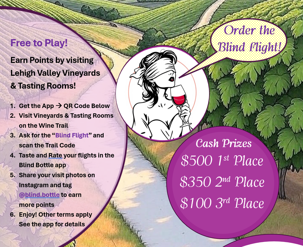 Join us on a Summers’ Long Blind Tasting Tour of Lehigh Valley Vineyards, Tasting Rooms, and Restaurants. Test your wine knowledge as you sample blind (unmarked) flights and interact with the BlindBottle app to learn and record your tasting notes. Free to play! Get started by visiting one of the participating venues listed below from July 1 through August 31st.